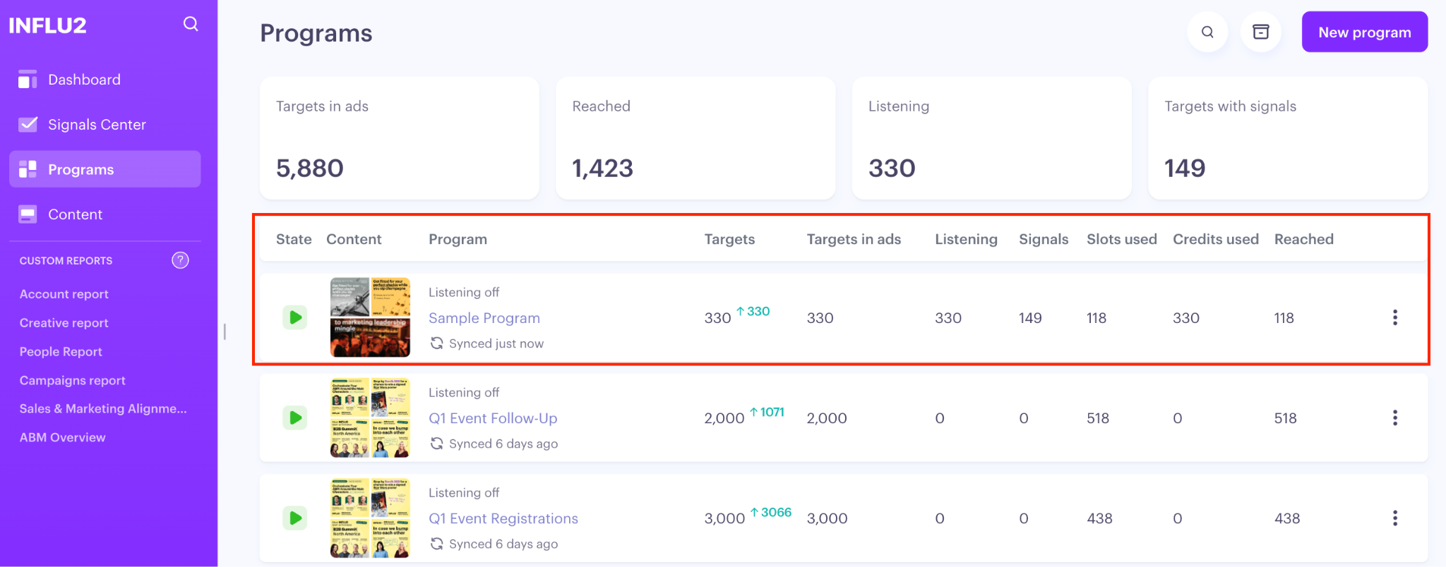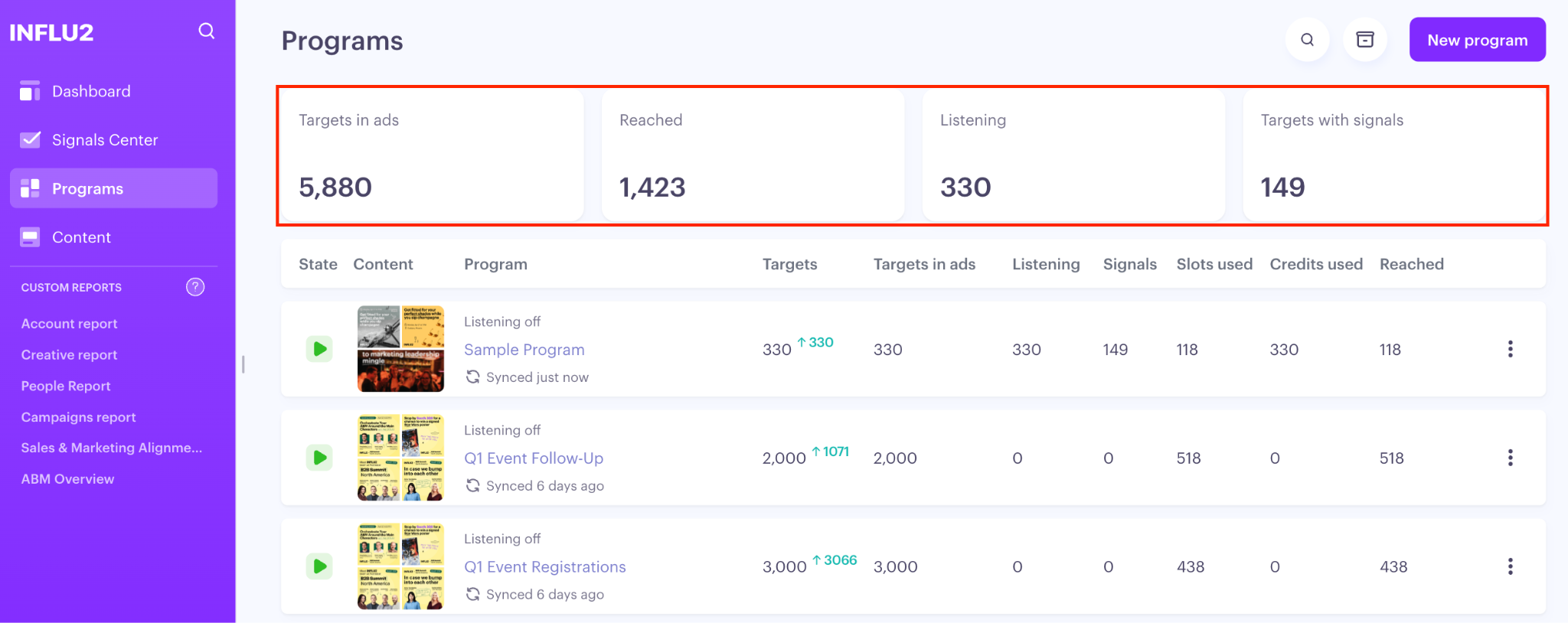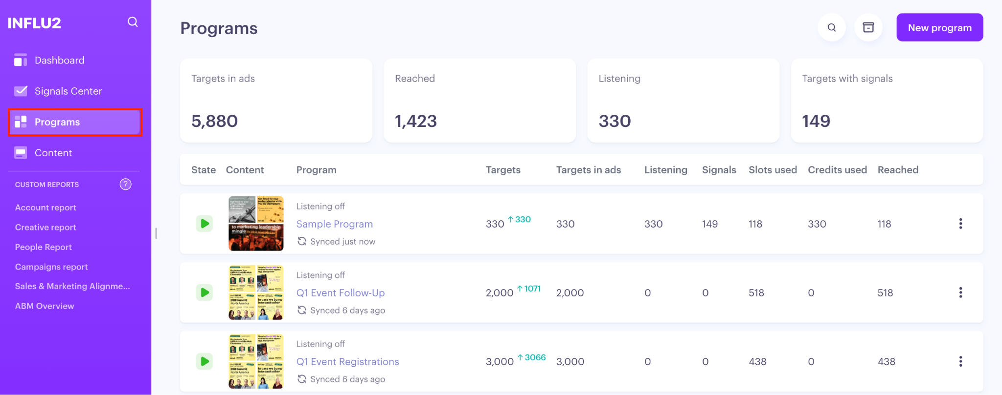 Programs are how you run a complete ABM campaign inside Influ2. Instead of managing your audience, journey, and ad campaigns in separate places, a Program brings them together so you can manage, monitor, and optimize in one place .